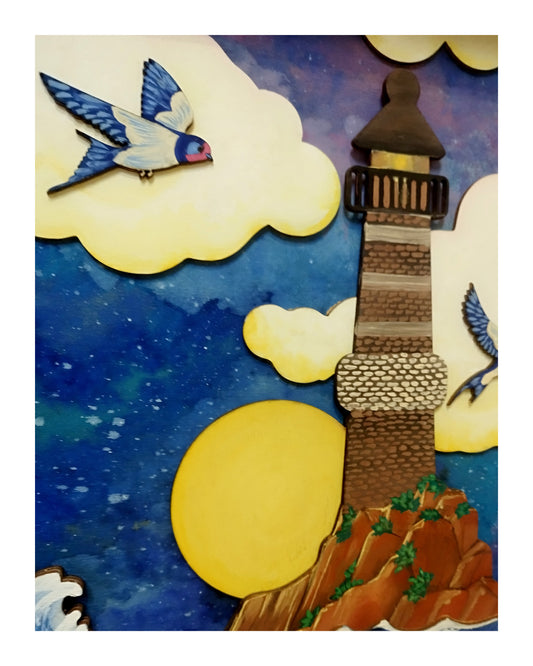 Tableau en bois – Mer en tempête et hirondelles – Coucher de soleil