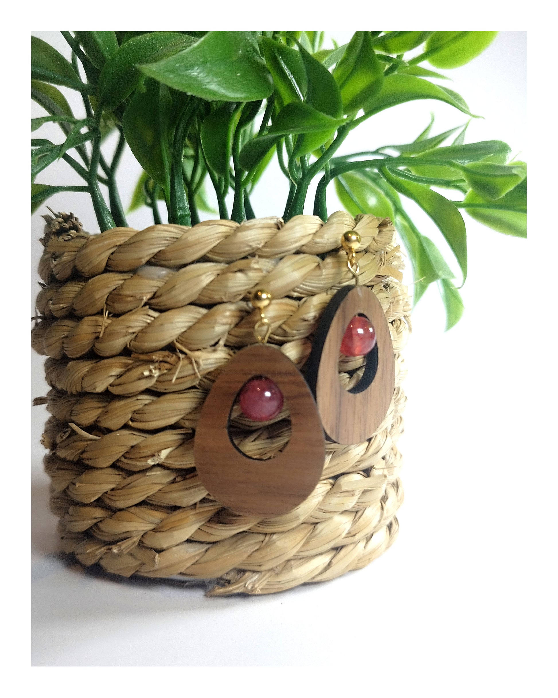 Boucle d'oreille - goutte en noyer & perles rouge framboise
