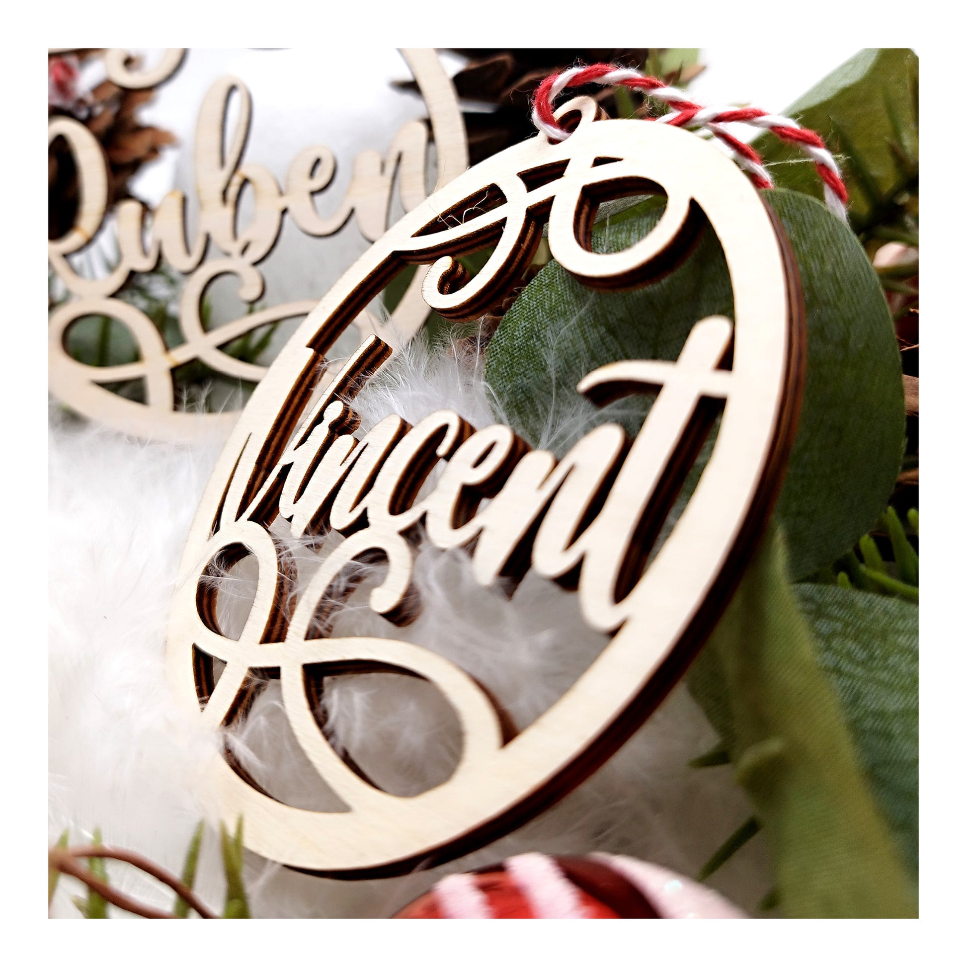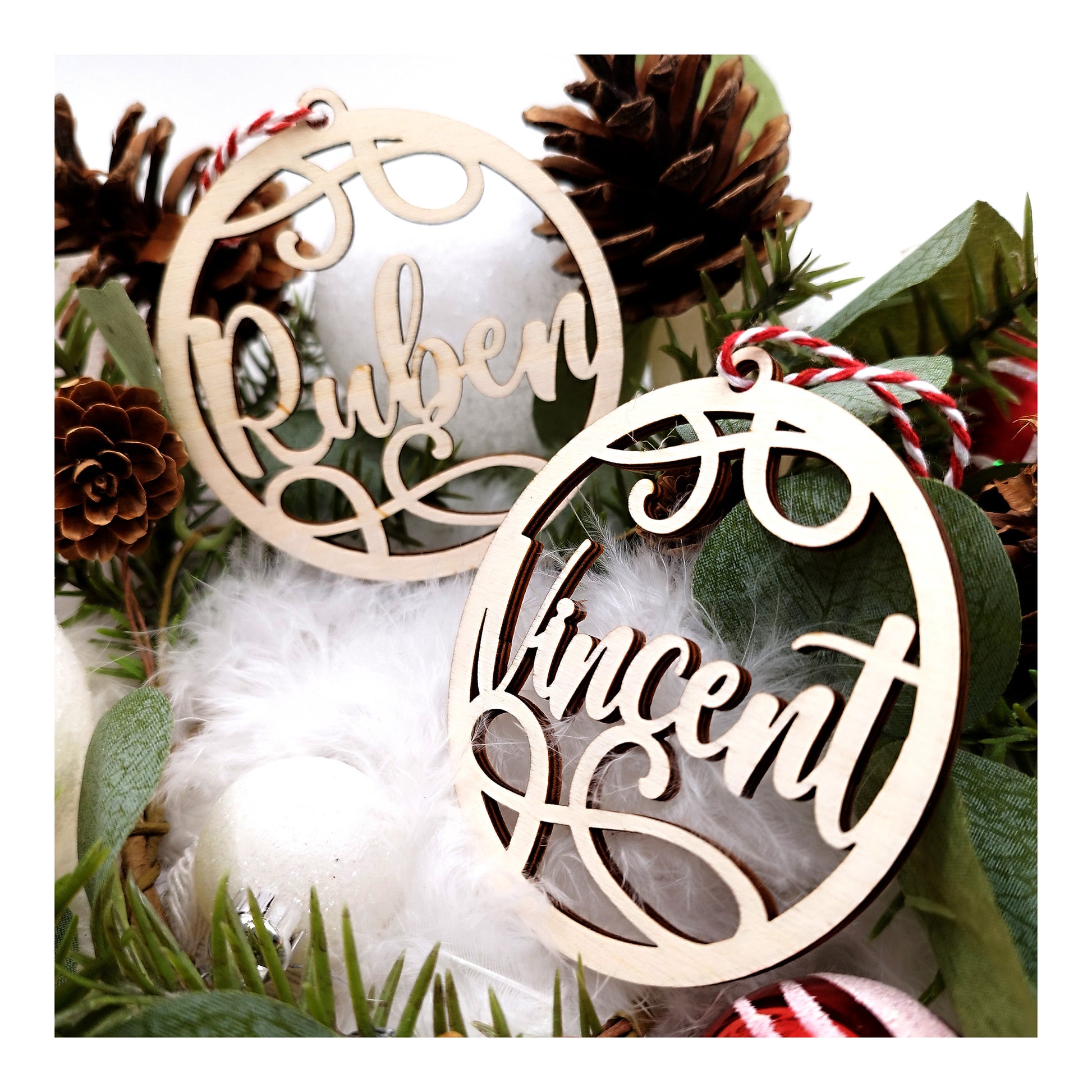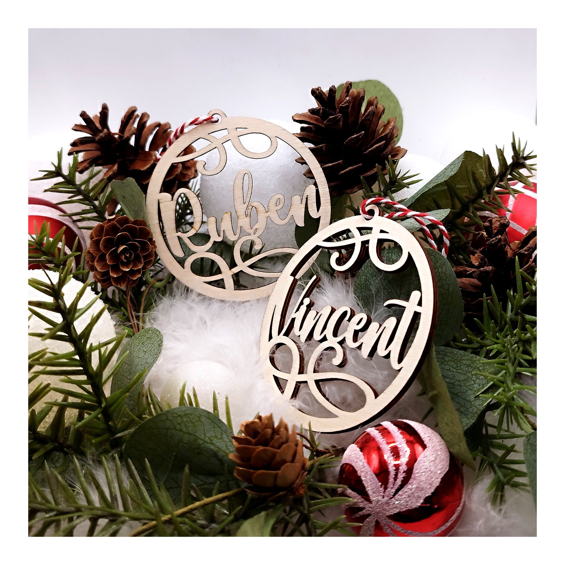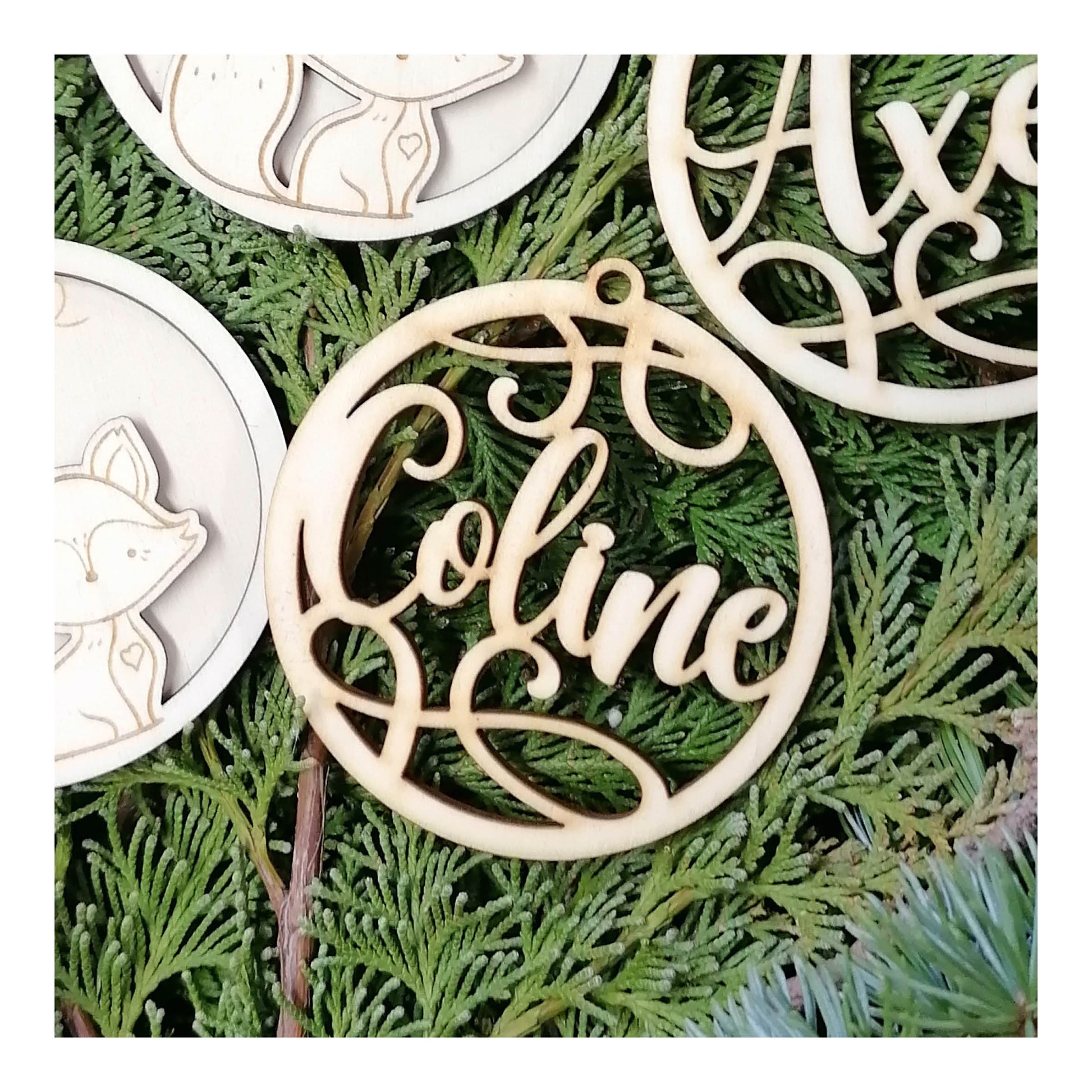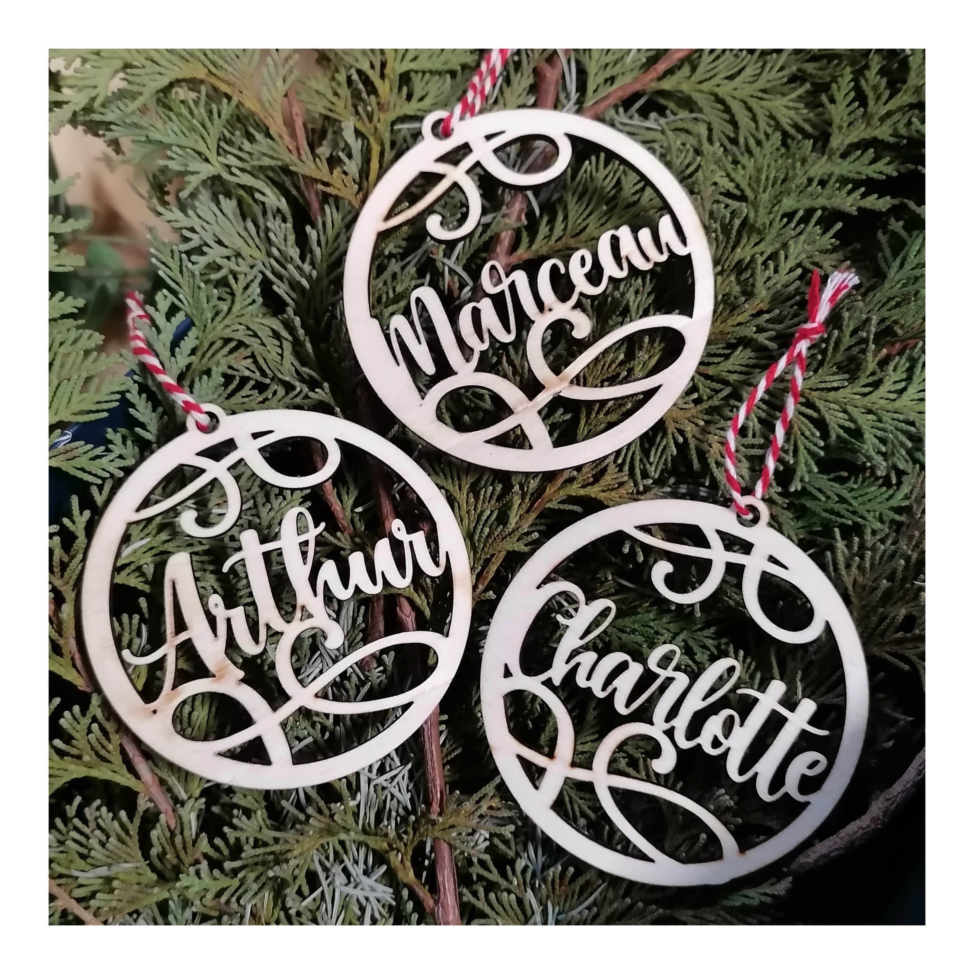 Boules de noël - prénom découpé sur mesure - pièce unique - personnalisées en bois peuplier - prénom ou nom de famille, ou entreprise