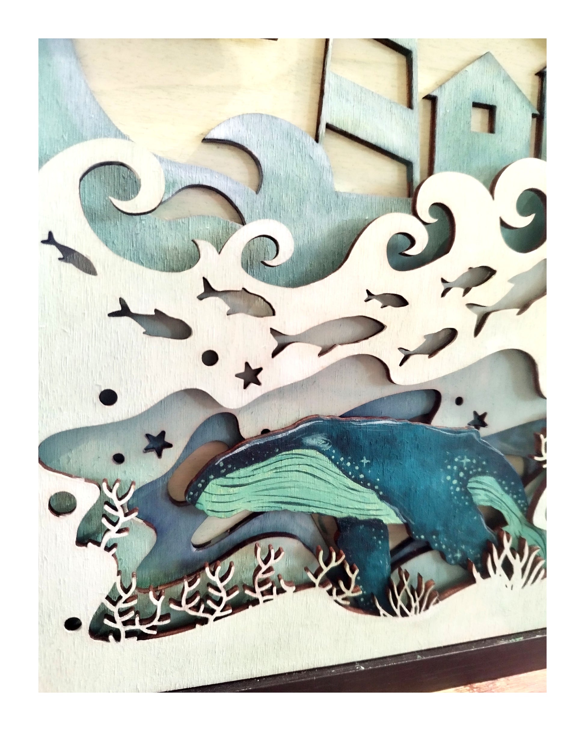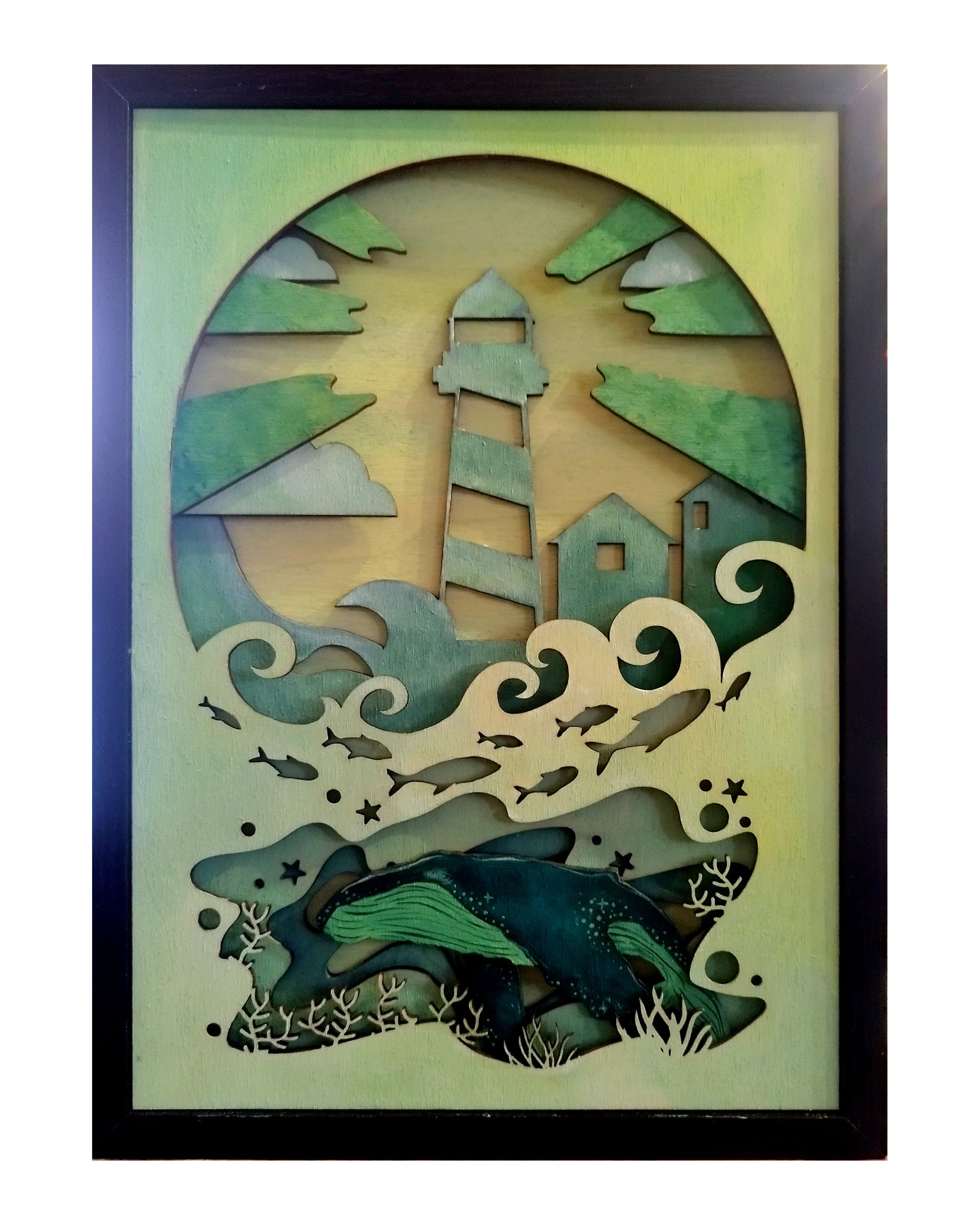 Ce cadre décoratif en bois format A4 met en scène un phare lumineux et une baleine, revisités à chaque création. Réalisé à partir de 5 épaisseurs de bois, il offre un jeu de reliefs et de profondeurs qui donne vie à la composition.