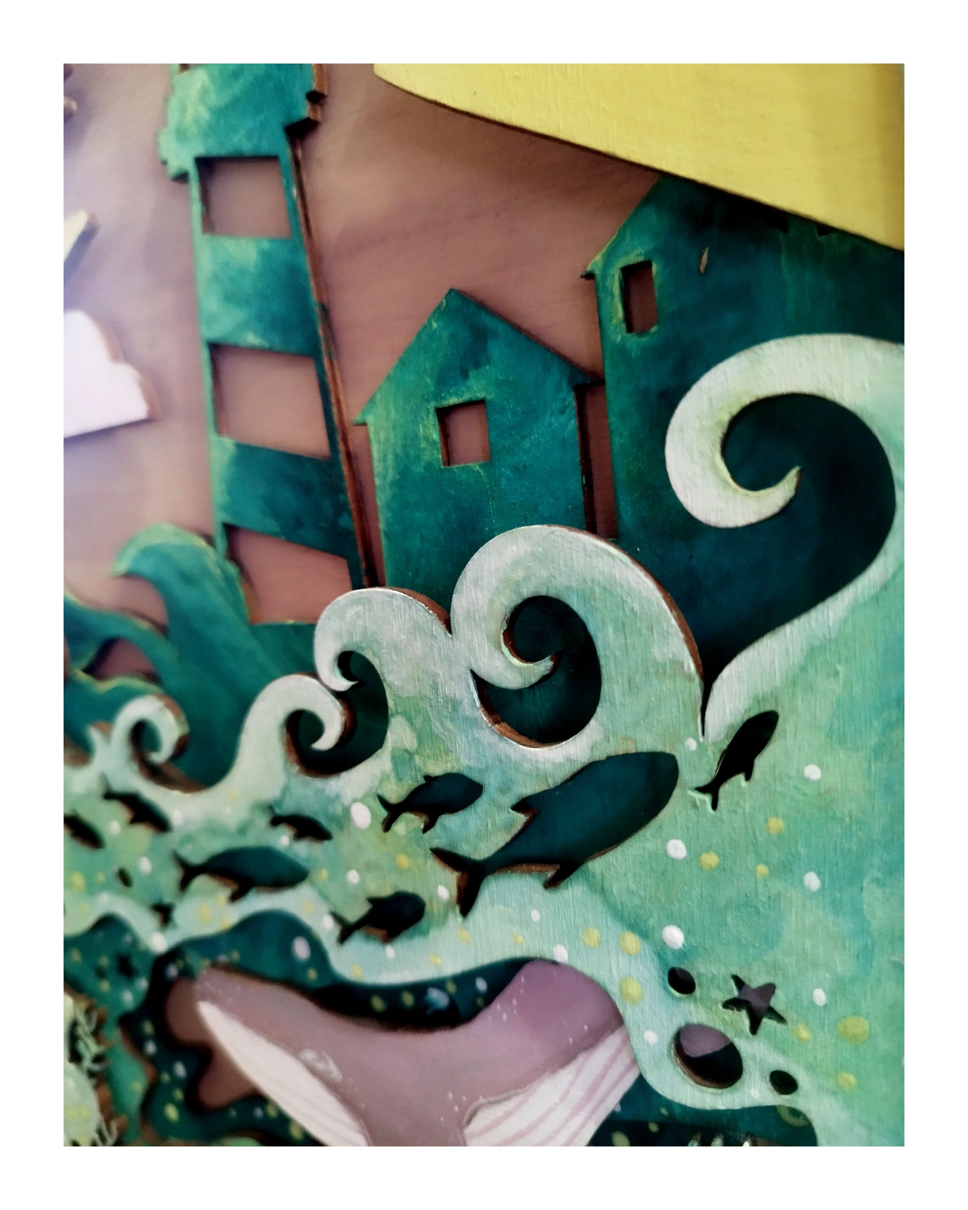 Ce cadre décoratif en bois format A4 met en scène un phare lumineux et une baleine, revisités à chaque création. Réalisé à partir de 5 épaisseurs de bois, il offre un jeu de reliefs et de profondeurs qui donne vie à la composition.