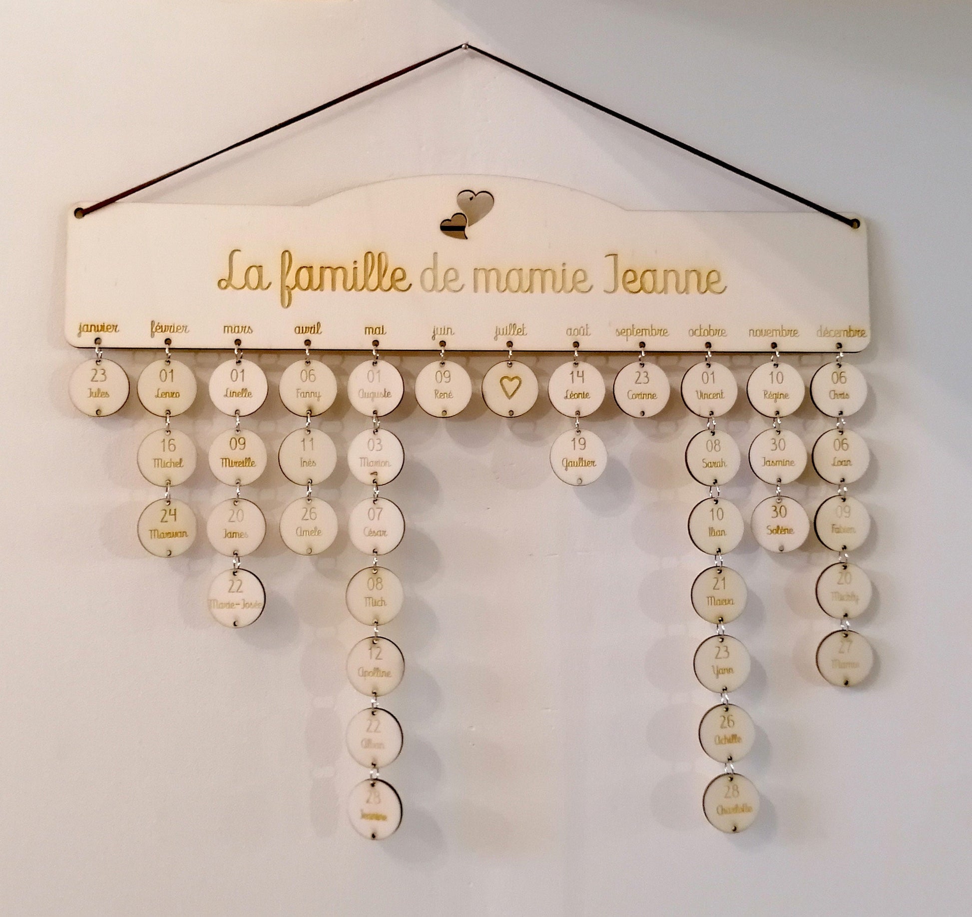 La décoration fait 41 cm de largeur et 3mm d'épaisseur avec en gravure le Calendrier de la famille "...", la hauteur dépendra du nombre de pastille choisies !