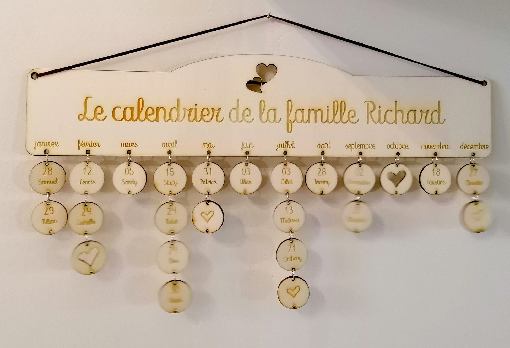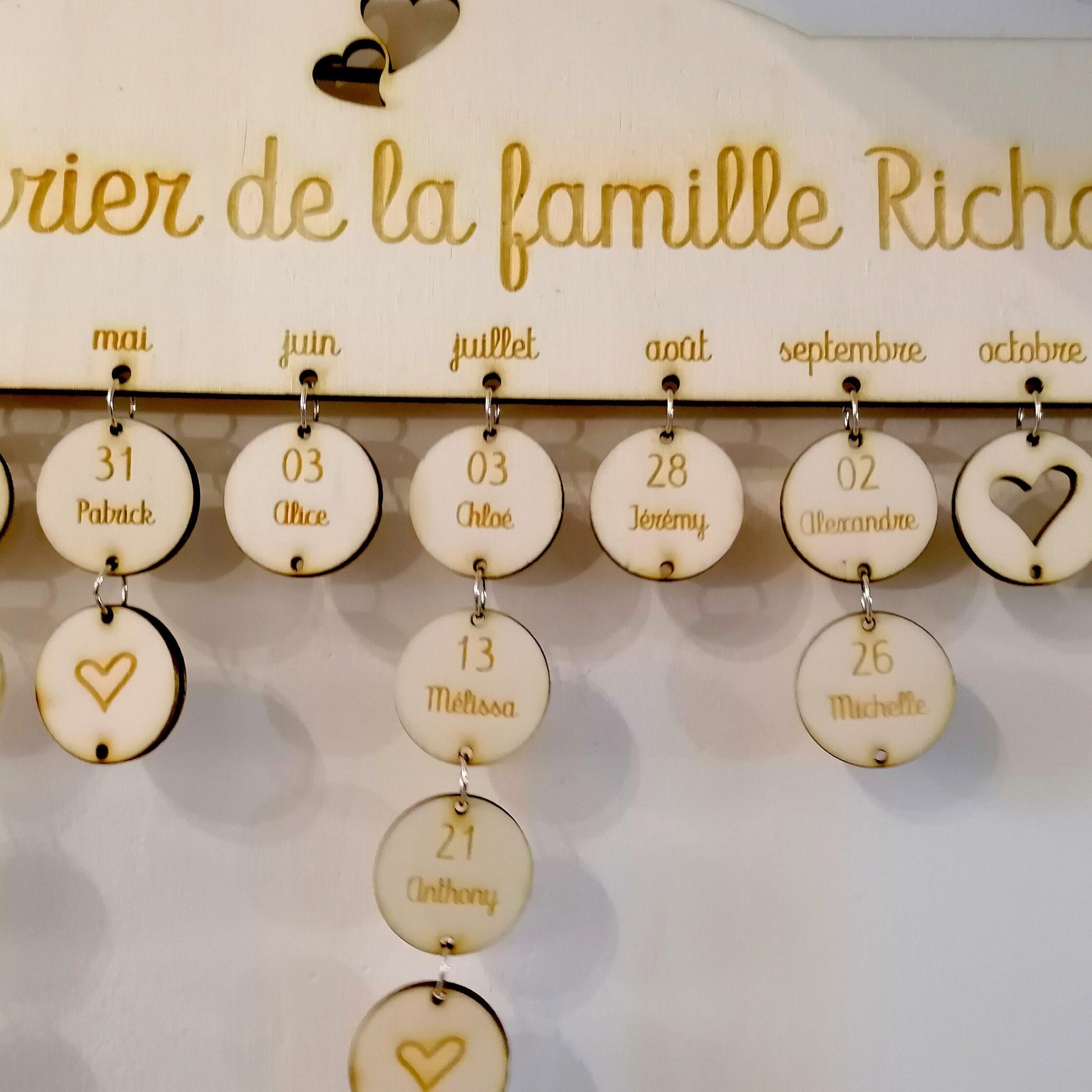 Calendrier des anniversaires perpétuel et coeur - suspension décoration en bois - gravure personnalisée
