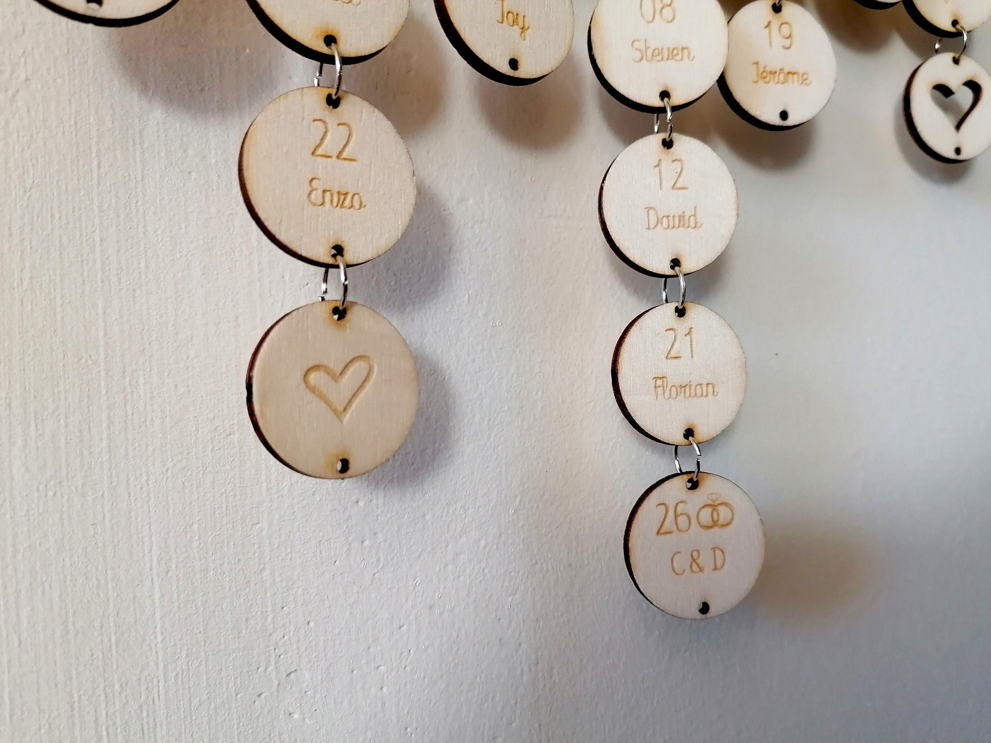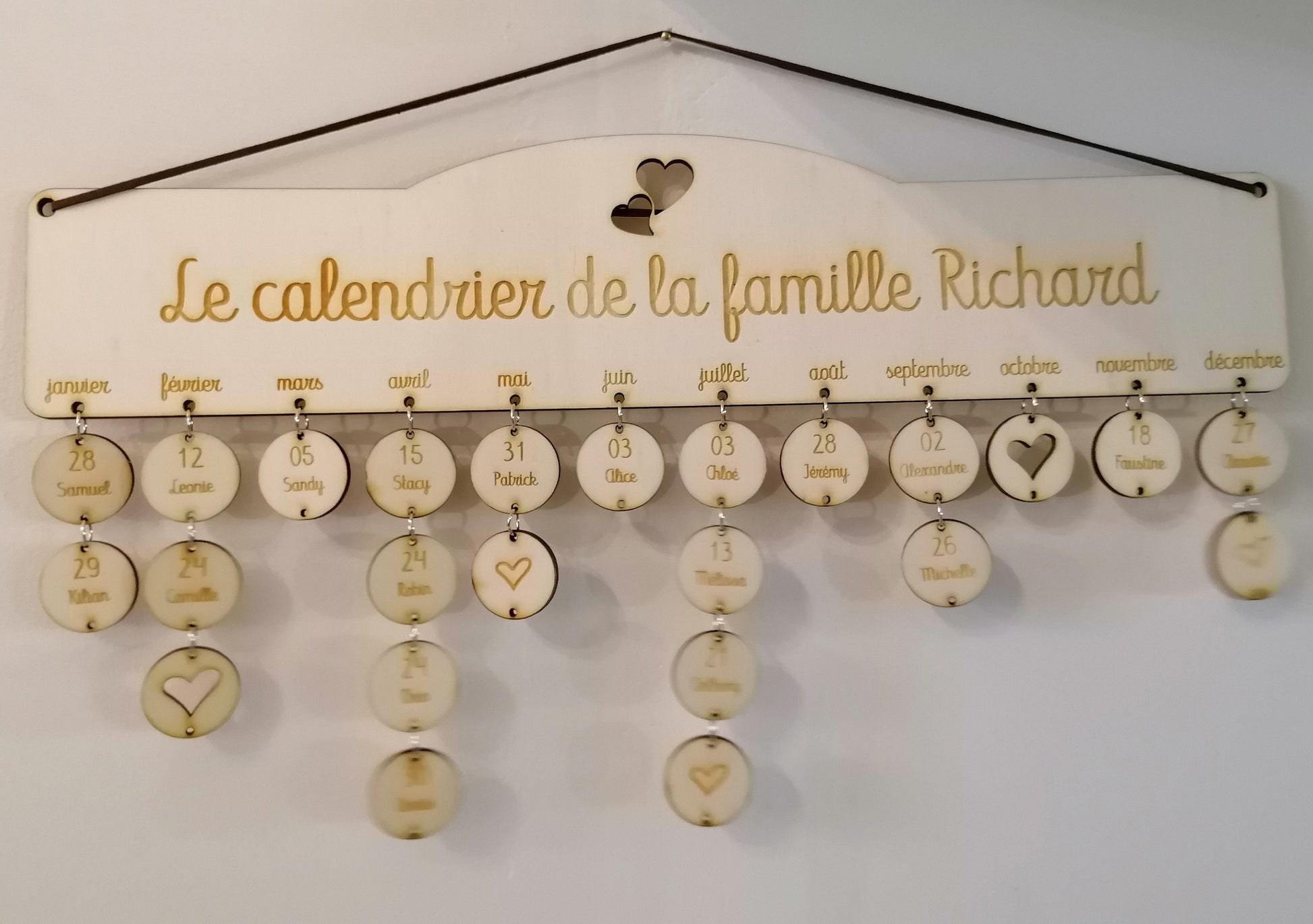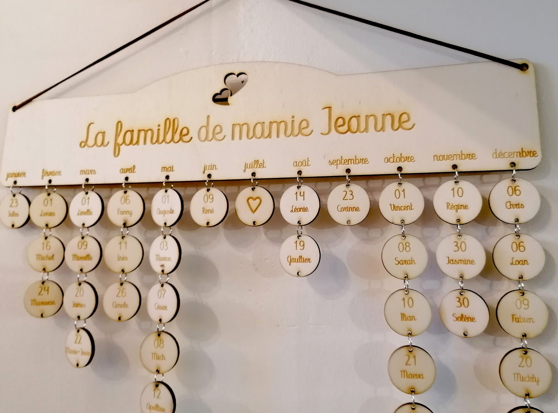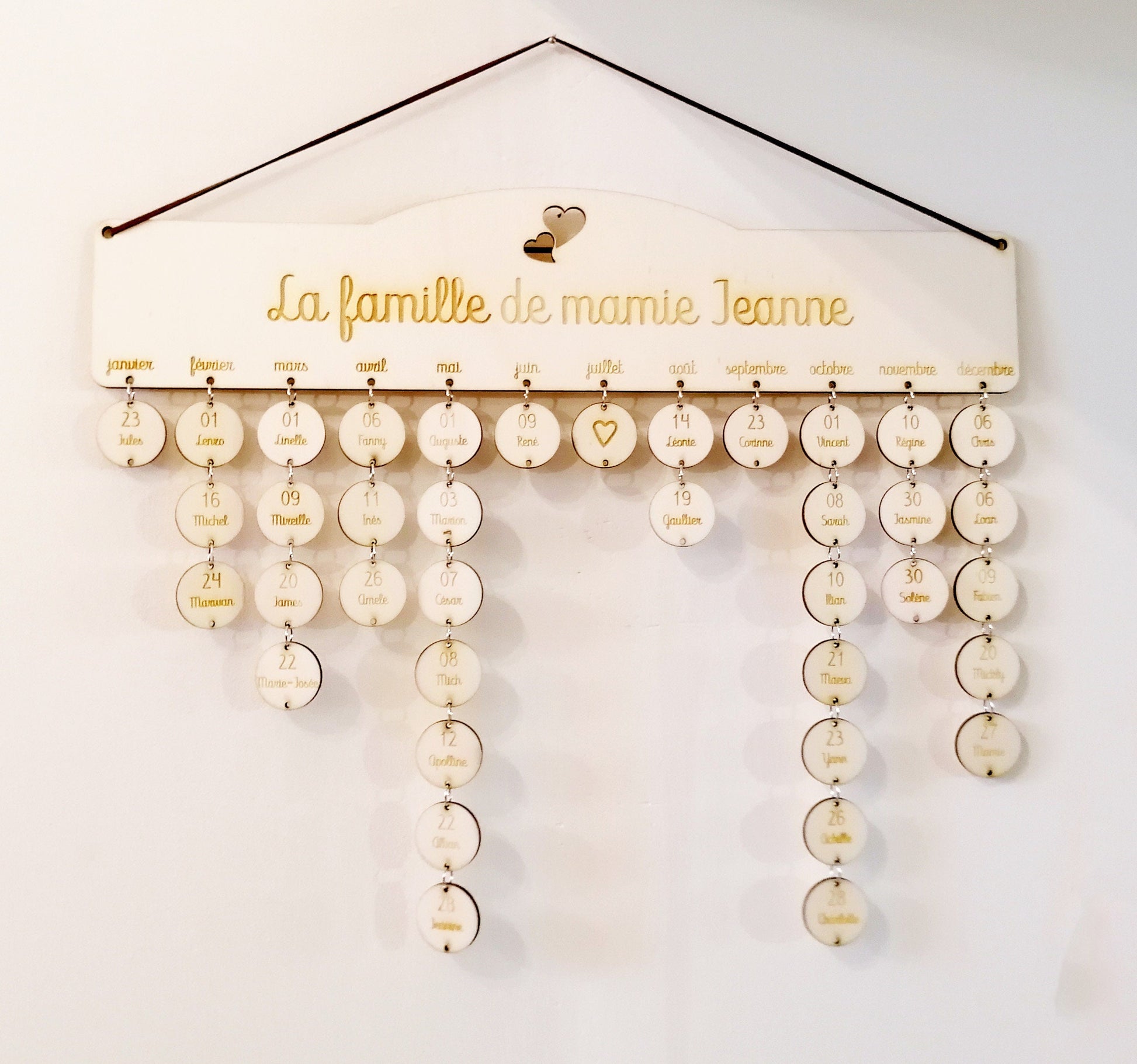 - le calendrier personnalisé avec le nom de famille, vos prénoms et dates gravées (vous pouvez ajouter ce que vous souhaitez même des anniversaires de mariage ! : gravure alliance, initiales, cœurs sans surcoût). Il vous arrive assemblé quand vous choisissez cette finition.